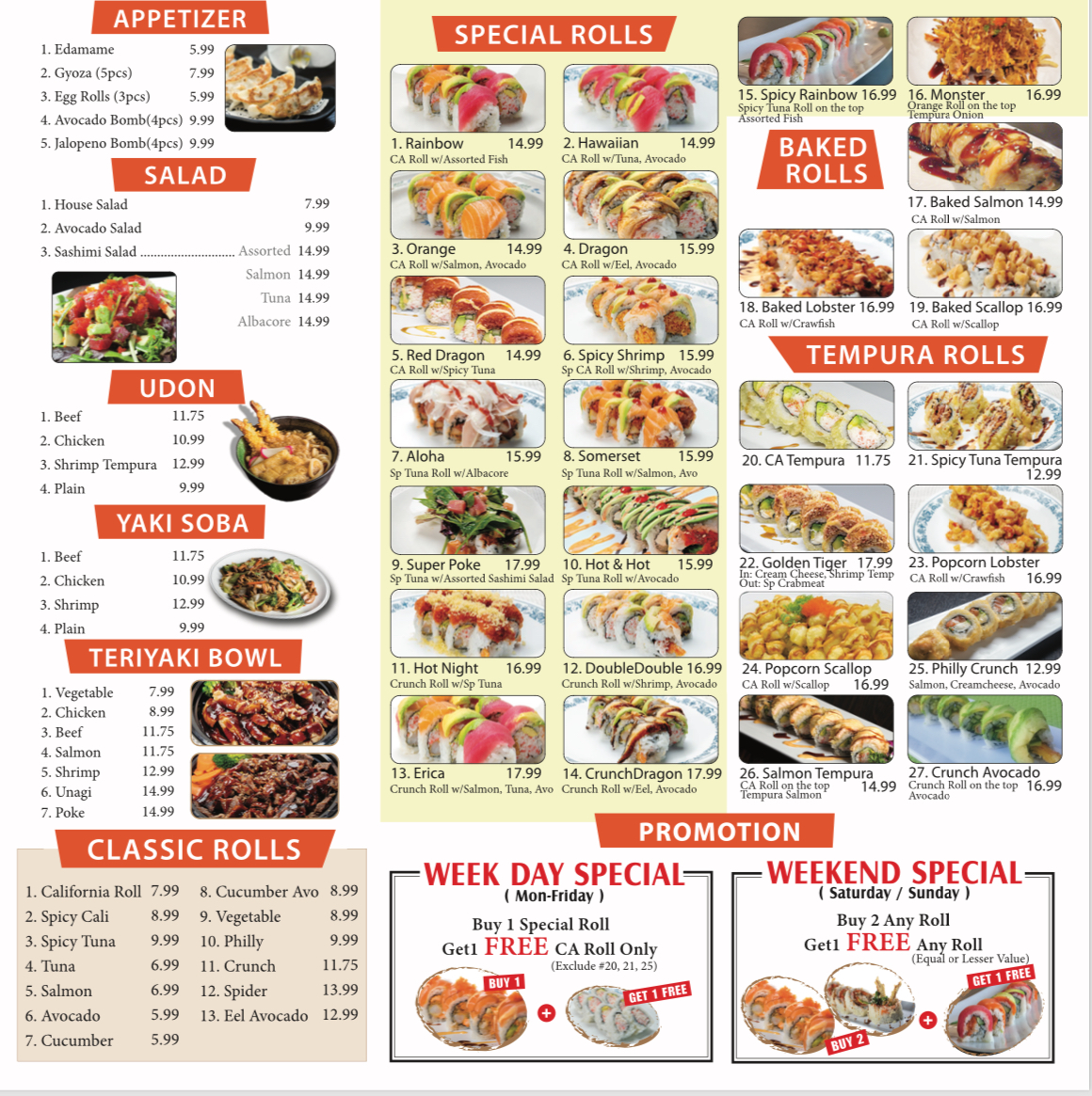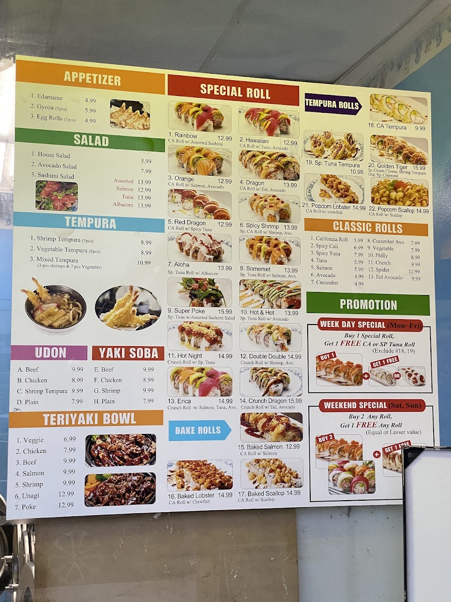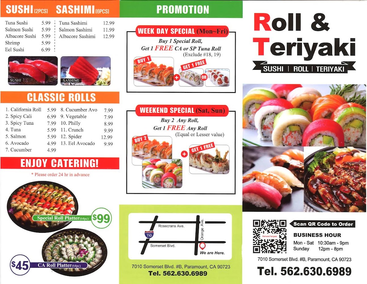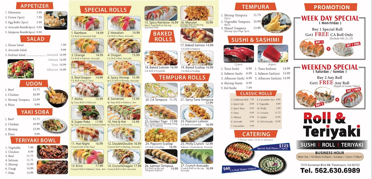 The menu at Roll And Teriyaki at 7010 Somerset Blvd Suite B in Paramount offers a well-rounded selection that caters to both sushi enthusiasts and fans of hearty Japanese comfort food. For starters, the House Salad, Avocado Salad, and Sashimi Salad provide fresh, crisp options, while the appetizers like Edamame, Gyoza (5pc), Egg Rolls (3pc), Avocado Bomb (4 Pcs), and Jalopeño Bomb (4 Pcs) set the tone for flavorful bites. Sushi lovers can choose from classics such as Tuna Sushi (2pc), Salmon Sushi (2pc), Albacore Sushi (2pc), Shrimp Sushi (2pc), and Eel Sushi (2pc), alongside their sashimi counterparts including Tuna Sashimi (6pc), Salmon Sashimi (6pc), and Albacore Sashimi (6pc). The specialty rolls, like Crunch Dragon Roll, Dragon Roll, Orange Roll, Spicy Shrimp Roll, and Somerset Roll, complement the baked and tempura options such as Baked Salmon Roll, Baked Lobster Roll, California Tempura Roll, Popcorn Scallop Roll, and Philly Crunch Roll, offering both indulgence and creativity. For something warm and satisfying, their Udon and Yakisoba dishes-including Beef Udon, Chicken Udon, Shrimp Tempura Udon, Plain Udon, Beef Yakisoba, Chicken Yakisoba, Shrimp Yakisoba, and Plain Yakisoba-deliver rich flavors, while the Teriyaki Bowls like Veggie Bowl, Chicken Bowl, Salmon Bowl, Shrimp Bowl, and Poke Bowl provide customizable, filling meals. Classic rolls such as Spicy California Roll, Spider Roll, Cucumber Roll, Tuna Roll, and Philly Roll round out the menu, along with sides like Extra Ginger, Extra Wasabi, Extra Eel Sauce, Extra Teriyaki Sauce, and Extra Tempura Sauce for added personalization. Overall, the menu balances traditional favorites with inventive rolls, hearty bowls, and a variety of sides, making Roll And Teriyaki a versatile spot for both casual dining and sushi exploration.